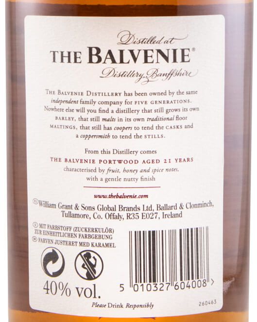 Cada Whisky da gama The Balvenie Single Malt Scotch Whisky é único: todos são ricos, luxuosamente suave e sustentados por um caráter distinto de mel. A qualidade excepcional de The Balvenie Single Malt Scotch Whisky devesse muito ao The Balvenie Malt Master, David Stewart e o fato de que a destilaria mantém um alto nível de habilidade que outros produtores de Whisky de malte não conseguem empregar. Em nenhum outro lugar conseguimos encontrar uma destilaria que ainda cultiva a sua própria cevada, mantêm os seus tradicionais terrenos e os seus próprios atresãos de cobre para reparar as suas destilarias.
