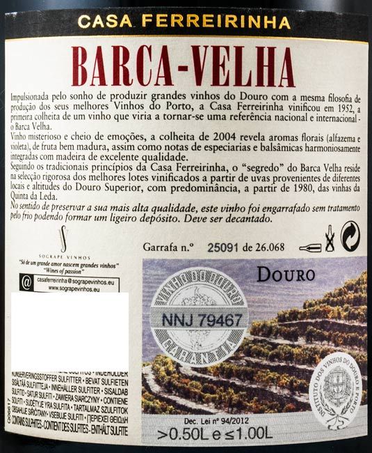 O Barca Velha de 2004 tem uma intensa cor rubi e uma grande harmonia de aromas complexos, com forte presença de frutos vermelhos bem maduros, nuances florais de alfazema e violeta, e uma excelente componente de especiarias. Na boca, revela-se volumoso, de acidez viva e bem integrada, com taninos bem presentes e de excelente qualidade. O final é muito longo e complexo, com uma delicadeza e simultânea estrutura assinaláveis.