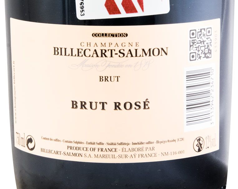 Billecart-Salmon Brut Rosé é uma mistura de Chardonnay, Pinot Meunier e Pinot Noir vinificados como vinho branco, com uma pequena percentagem de Pinot Noir vinificado como vinho tinto. A sua cor rosa pálida é adornada com resplendores quentes de ouro, e as suas bolhas delicadas, lentamente crescentes conferem-lhe uma mousse persistente. Este cuvée revela um aroma subtil que leva a um obuquet elegante e delicado de notas perfeitas de frutos vermelhos. O seu método especial de vinificação dá a este cuvée um ataque leve, elegante, seguido por um final fresco. Esta champanhe Rosé é um aperitivo ideal, mas também pode acompanhar um prato do salmão selvagem ou do sushi. Para a sobremesa, ele acrescentará um toque elevado aos sabores de frutos vermelhos.
