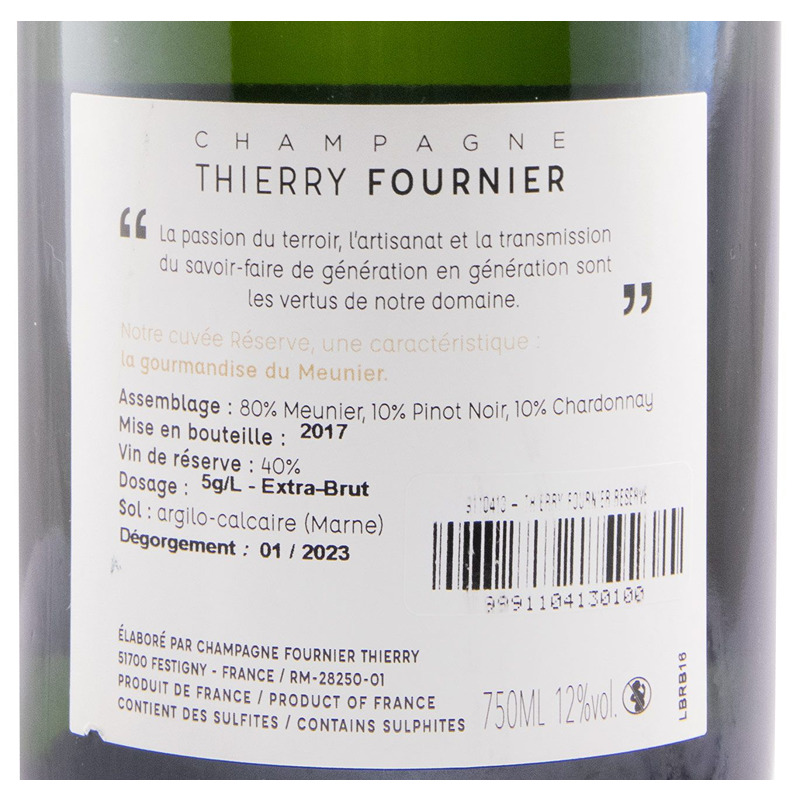 O Champagne Thierry Fournier Réserve Bruto é o resultado de um conjunto de diferentes terroirs, e produzido a partir das castas Meunier, Pinot Noir e Chardonnay. Apresenta-se de cor amarelo dourado brilhante, com notas de frutos secos e citrinos. No paladar é rico equilibrado, untuoso e com uma excelente acidez.