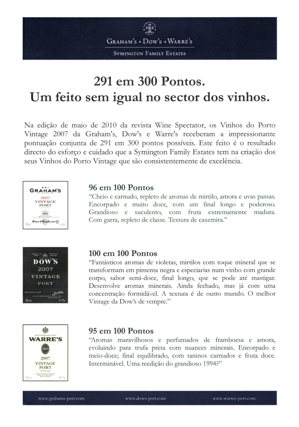 Na edição de Maio de 2010 da Revista Wine Spectator, os Vinhos do Porto Vintage 2007 da Graham's, Dow's e Warre's receberam a impressionante pontuação conjunta de 291 em 300 pontos possíveis. Este feito é o resultado directo do esforço e cuidado que a Symington Family Estates tem na criação dos seus Vinhos do Porto Vintage que são consistentemente de excelência.