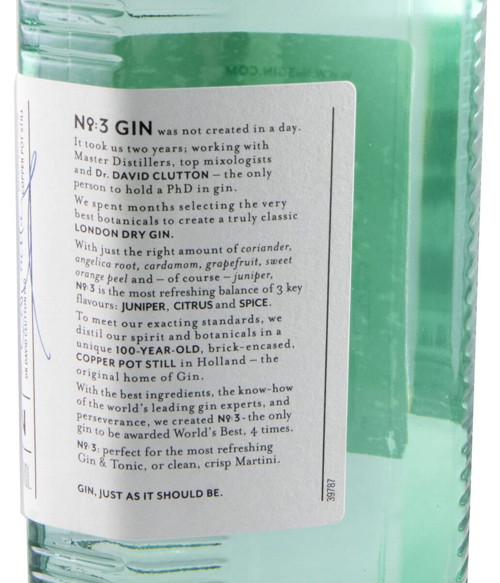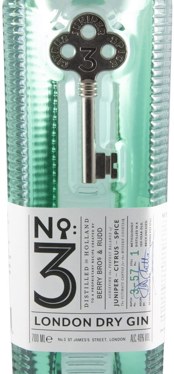 São poucas as especiarias, conhecidos colectivamente como botânicos, suficientes para obter o sabor do No.3 London Dry Gin: O zimbro, da Itália, dá o gosto inconfundível de pinho e lavanda. A casca de laranja da Espanha fornece a frescura na forma mais pura e a casca de toranja dá um toque citrino extra. A raiz de Angelica ajuda a tornar o gin seco. A semente de coentro vinda de Marrocos, libera o aroma de limão e dá-lhe um final ligeiramente picante. E, finalmente, o cardamomo adiciona um toque picante aromático e uma sensação de calor. O gin é produzida pela mítica Berry Bros & Rudd, uma dos mais antigos Comerciantes de bebidas do mundo, com negócios do ramos desde 1698, e acham que não é necessário a utilização de mais botânicos que possam prejudicar os sabores essenciais de um verdadeiro London Dry gin. O nome No.3 refere-se ao endereço na Rua de St James, em Londres, onde está situada a casa da Berry Bros & Rudd desde a sua fundação. O gin nº3 celebra, descaradamente, a integridade e o caráter do tradicional London Dry Gin: destilação em alambiques de cobre tradicionais, para que os sabores fiquem perfeitamente equilibrados, ou seja, é o 'sabor da tradição'. Para um bom gin tónico com London nº3 basta, para manter a tradição de um bom Gin Tónico, simplesmente adicionar uma casca de Limão.