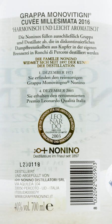 A arte da destilação tem sido um privilégio da Família Nonino desde 1897. Qualidade, inovação, pesquisa, profissionalismo e amor pelo seu trabalho são a sua imagem de marca distintiva. Orazio Nonino, o fundador da família, é finalmente seguido por Luigi, Antonio, Benito com Giannola, Cristina, Antonella e Elisabetta. Orazio Nonino estabeleceu a sua própria destilaria em Ronchi di Pavia mas até este ponto, a sua destilaria era apenas um móvel montado sobre rodas.