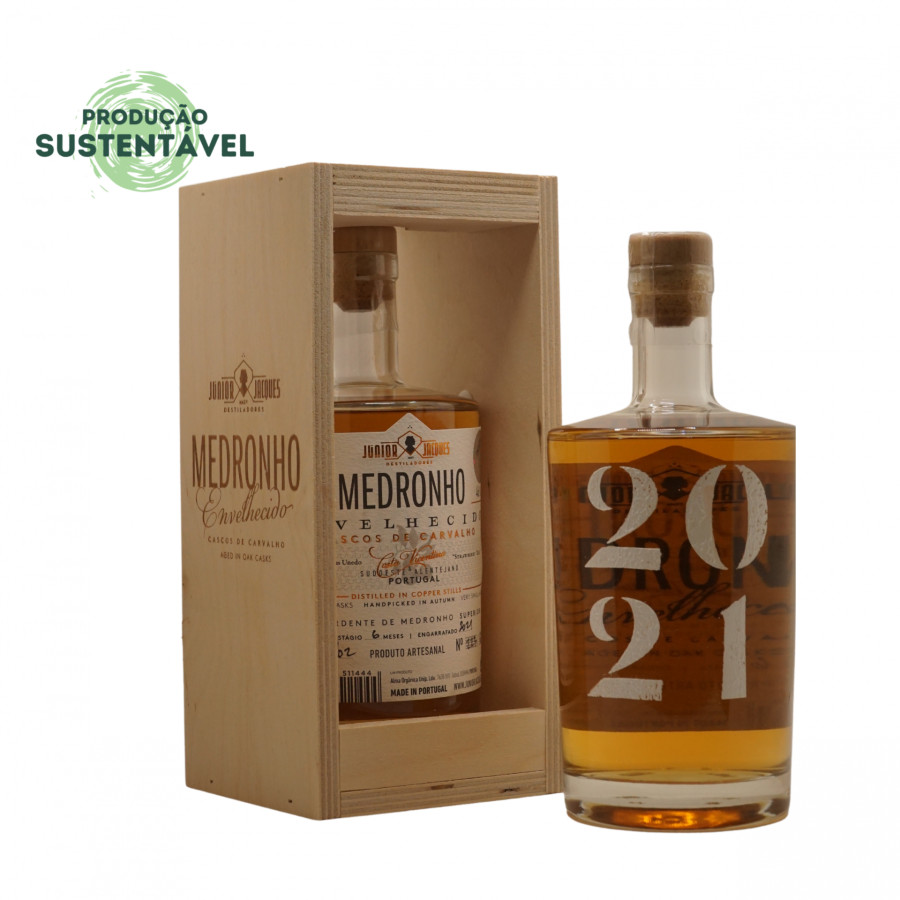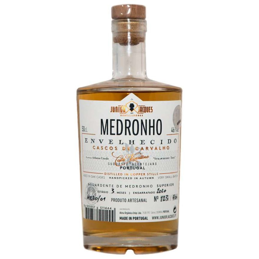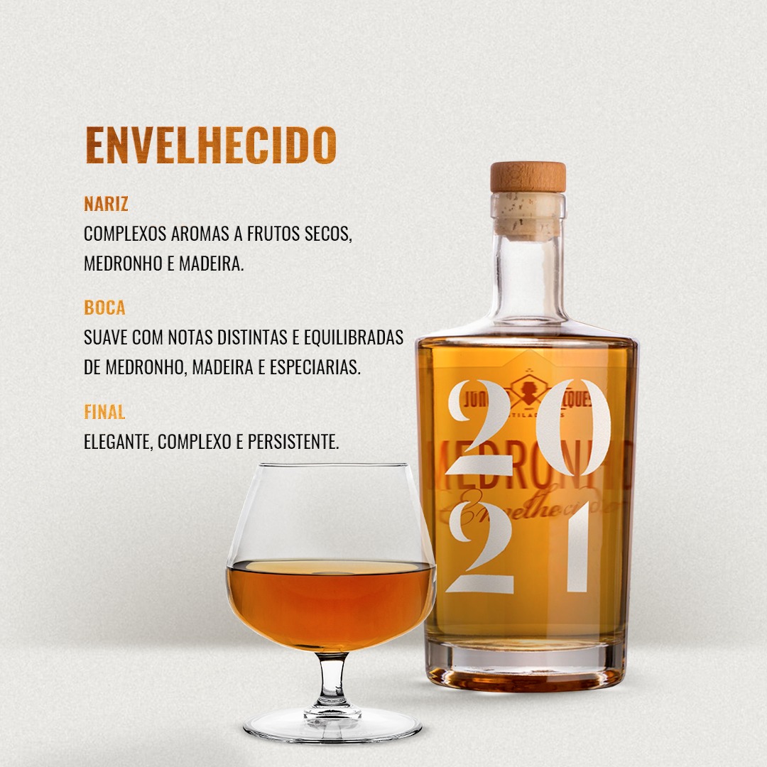 Júnior Jacques apresenta a essência original do Sudoeste. Produzido com fruta madura colhida no Outono, destilado artesanalmente num pequeno alambique de cobre no inesquecível ano de 2021 e com um estágio subtil de 6 meses em cascos de carvalho, este Medronho Envelhecido é uma sublime ode à tradição. A sua elevada graduação atesta a pureza dos destilados, feitos exclusivamente a partir do fruto do medronheiro, com um complexo aroma a frutos secos, madeira e especiarias. Ao paladar é delicado, suave e surpreendentemente frutado, onde o sabor do medronho se funde com outros aromas exóticos. O final é prolongado, com notas persistentes a carvalho e especiarias. Um destilado superior que pode ser apreciado de forma simples ou com gelo.