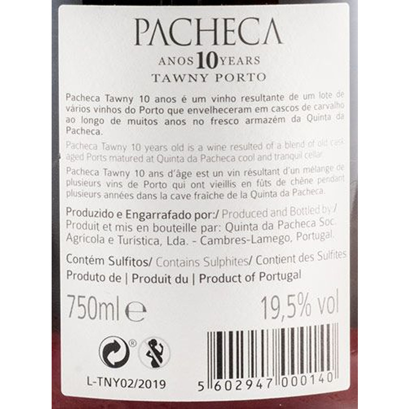 Pacheca Porto Tawny 10 Anos é um vinho resultante de um lote de vários Vinhos do Porto que envelheceram em cascos de carvalho ao longo de muitos anos no fresco armazém da Quinta da Pacheca. Durante o envelhecimento o vinho adquire a sua cor caracteristica âmbar-aloirada. Apresenta-se com um nariz elegante, combinando aromas de frutos secos e complexas notas de chocolate, caramelo amanteigado e madeira fina de carvalho.