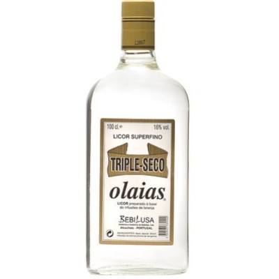 • Garrafa de licor Triple-Seco Olaia com tampa bege e etiqueta branca