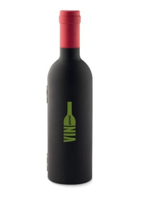 Set de vinho com garrafa Set de vinho apresentado numa caixa em forma de garrafa possui saca- rolhas, rolha e colar para a garrafa.